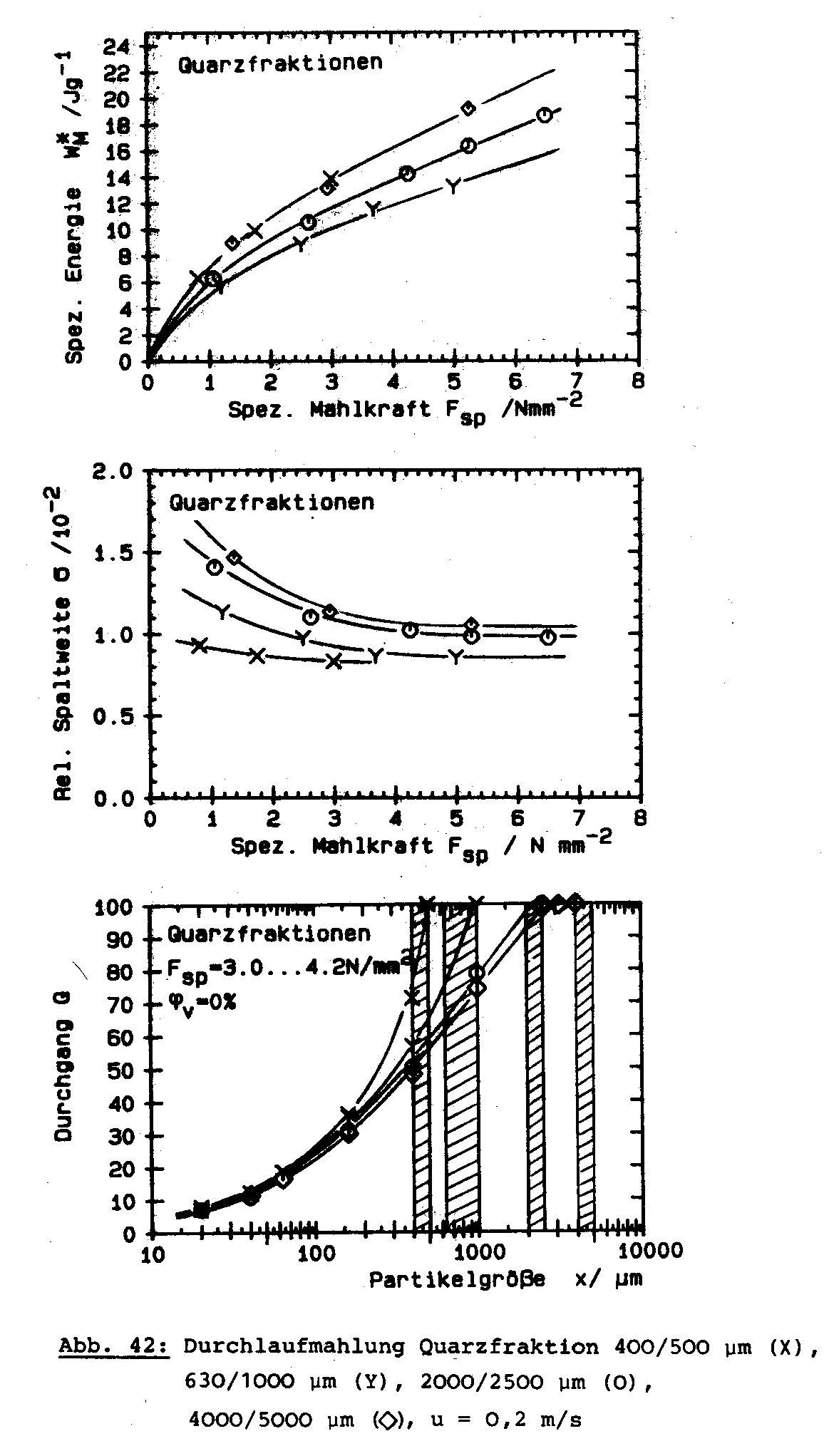 This page as well as the following web pages show the results of Schwechten [2] of single pass grinding tests with limestone, quartz, Rammelsberg ore and cement clinker as well as a simulated closed circuit grinding test with Kieserit at variation of feed size, moisture content and roller speed.